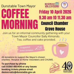 The Town Mayor cordially invites residents and local partners to a charitable coffee morning dedicated to supporting her chosen charities, two vital pillars of our community: CHUMS and Hospice at Home Volunteers. This event serves as a formal opportunity to advocate for the mental health of our youth and the dignity of those receiving end-of-life care.